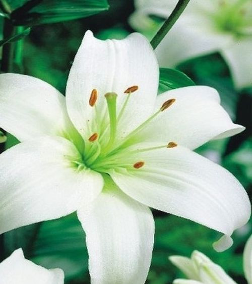 Hófehér, zöldes torkú virágait 100-120 cm-es, erős száron hozza.
