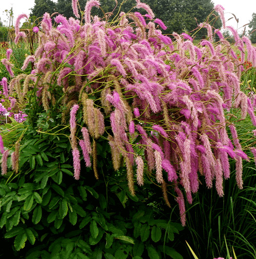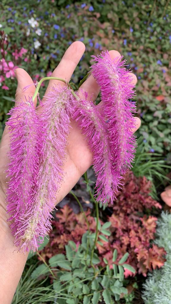 Különleges virágos évelő, magas száron növő, bolyhos, rózsaszín barkaszerű virágokkal.
