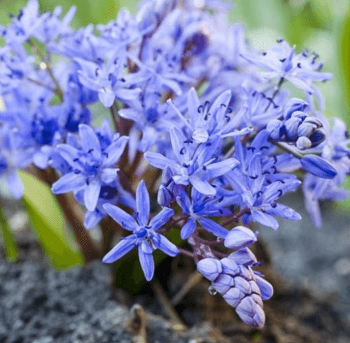 Az egyik legkorábban virágzó hagymás, kedves kék csillagvirágú fürtjei erőteljes zöld levelek között virítanak.