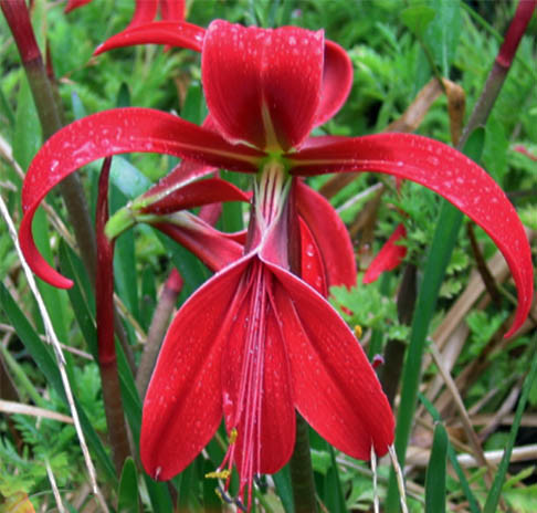 Érdekes formájú, látványos ragyogó karmazsinvörös virágai, kontrasztos, hosszú sárga porzói nagyon látványosak.