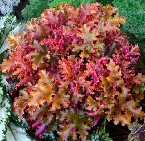 Különleges színű, erősen fodros szélű levelei változtatják a színüket.